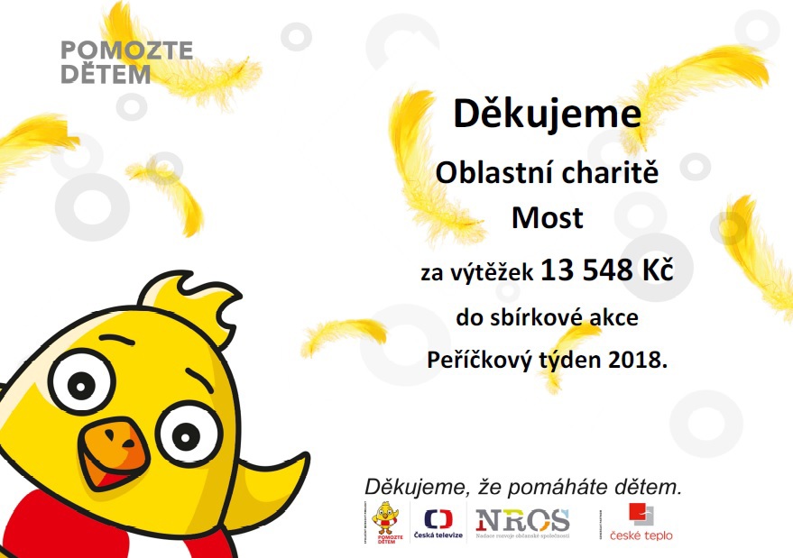 Peříčkový týden je celorepubliková sbírková akce Pomozte dětem, která tento rok proběhla i ve městech Litvínov, Meziboří, Horní Jiřetín a jejich okolí. Zaměstnanci Komunitního centra Janov tímto zviditelnili sbírkový projekt Pomozte dětem a od dárců vybrali finanční příspěvek ve výši 13 548 Kč.